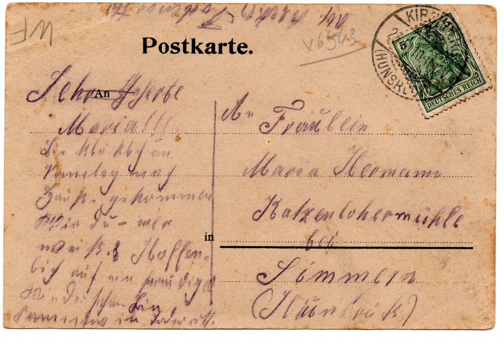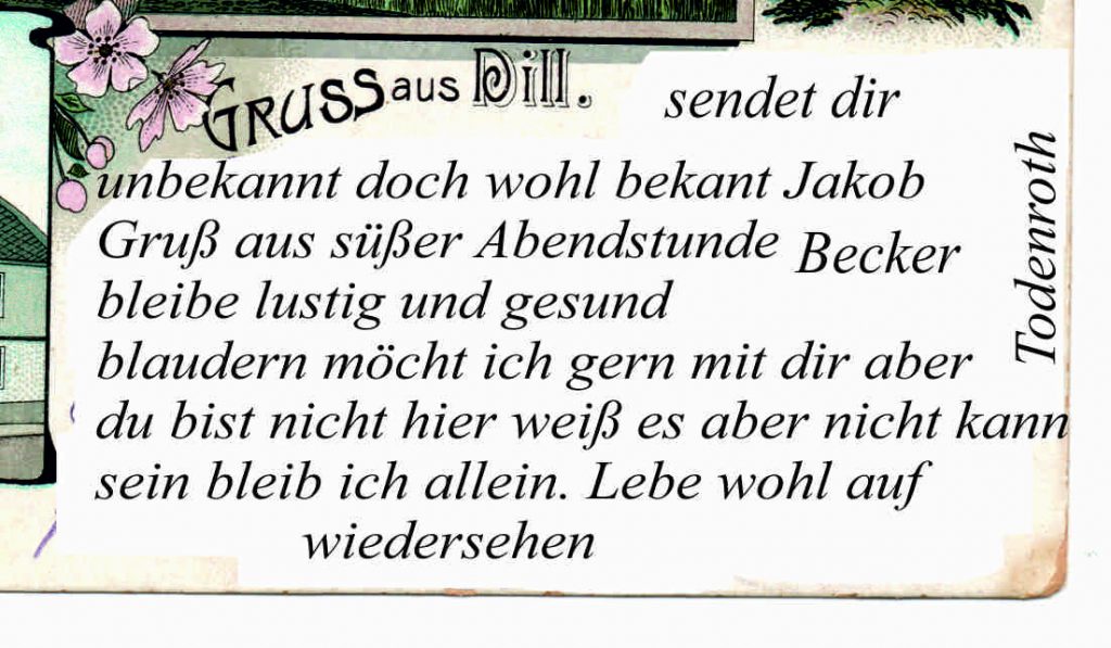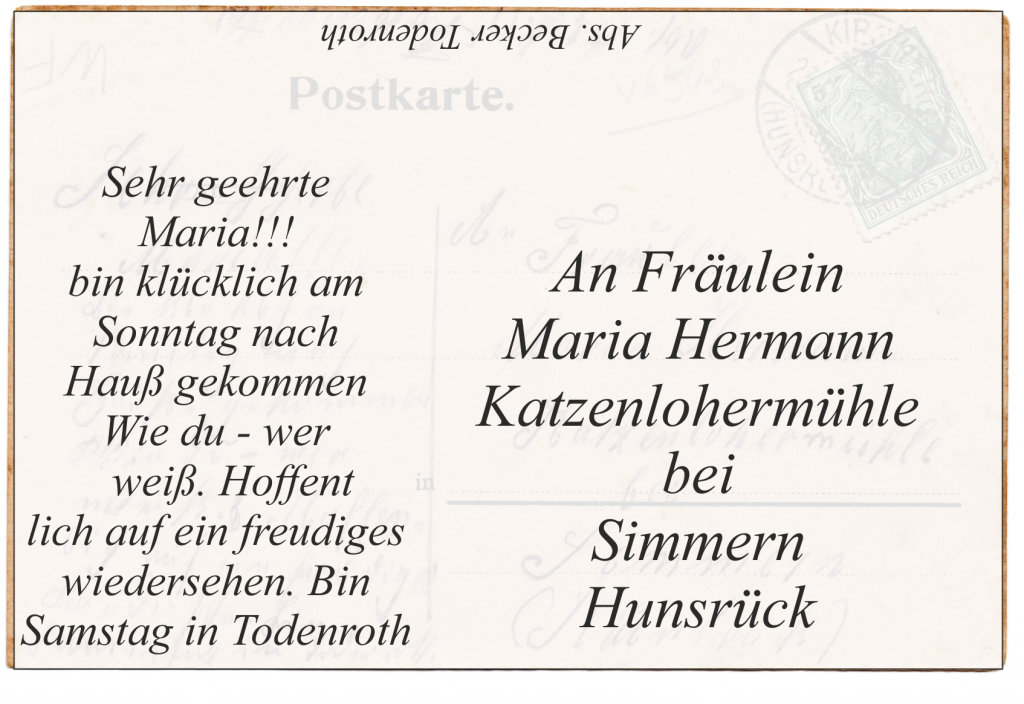 Das muß ein schlechter Postmensch sein, dem niemals fällt das Wandern ein – Das Wandern!                                                                  Vom Rhein in die Eifel, dann ins Moselland und nun sitze ich sogar auf dem Sohne aber verreisende Hunsrücker. Ergreift´s von Tag zu Tag fort und fort, doch stets denkt gern Ihrer         Ihr alter G. Jungbluth